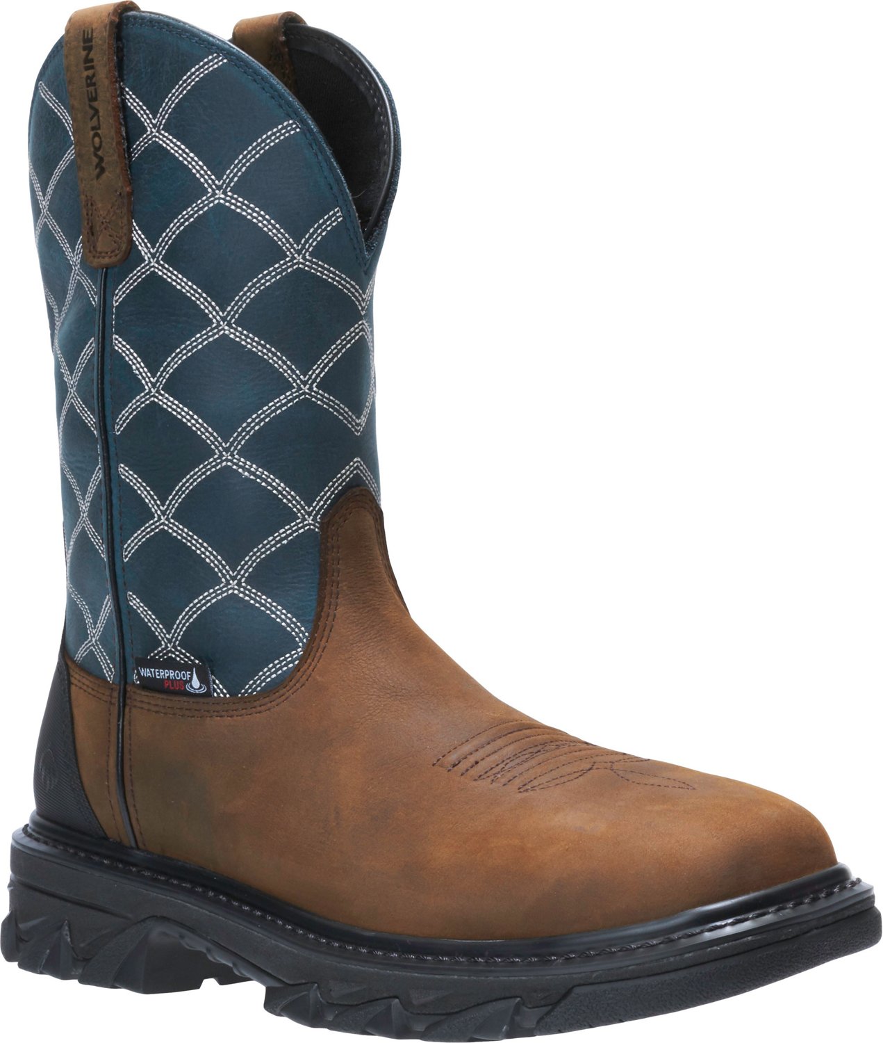 You can rely on these Wolverine Men's Ranch King CarbonMax Composite Toe 10 in Wellington Work Boots to help get you through the workday. They feature waterproof leather uppers with a Western design and patterned, contrast-color shafts for a unique look. CarbonMax composite toes help keep your feet safe, while the slip-resistant, rubber outsoles help you stay on your feet in wet and muddy conditions.
