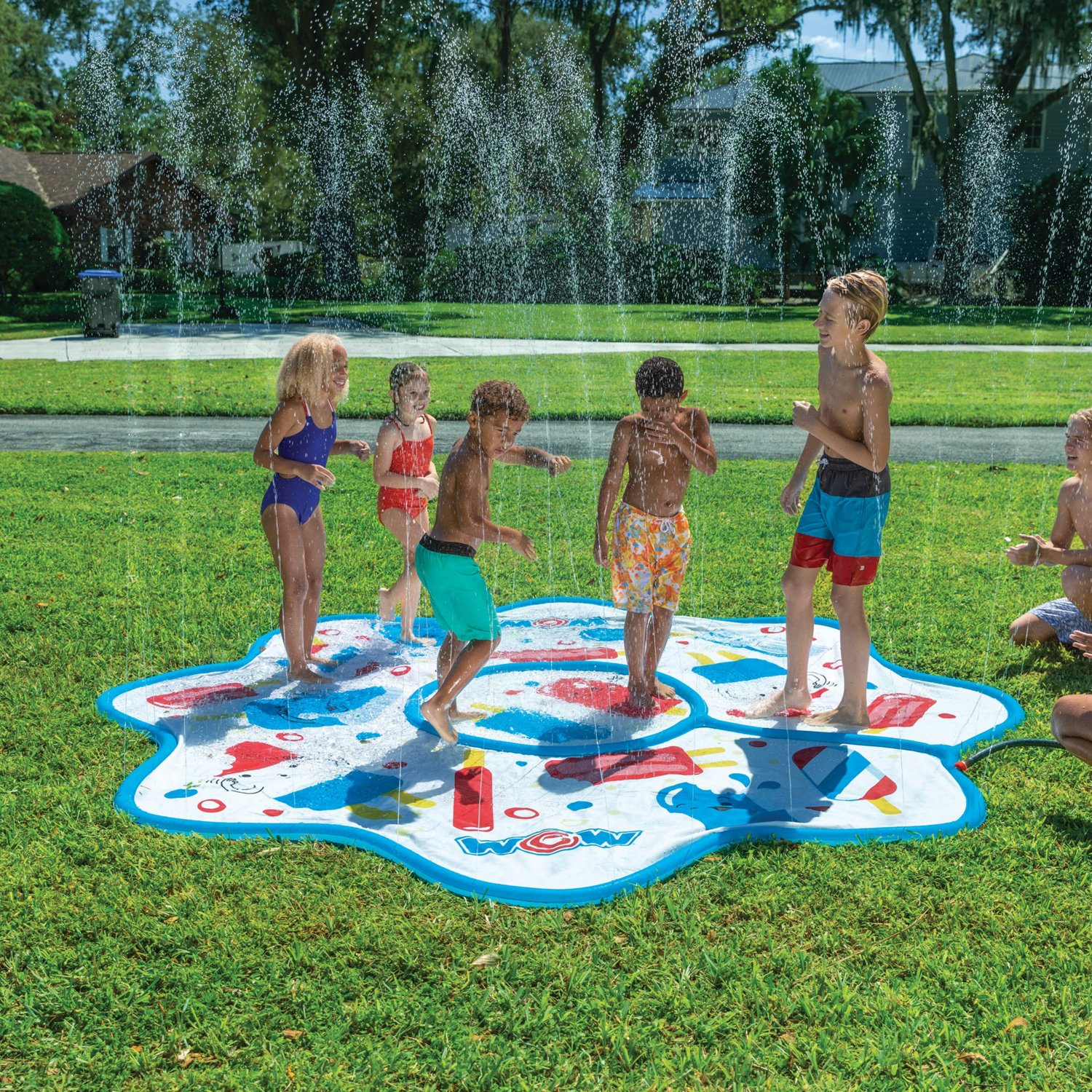 Help kids cool off with a WOW Watersports Popsicle Spray Pad Splash Mat. This 10 foot mat features a raised rim to keep water pooled while perforations spray in all directions, creating a wet and wild play area perfect for the hot months. Colorful graphics add to the fun.