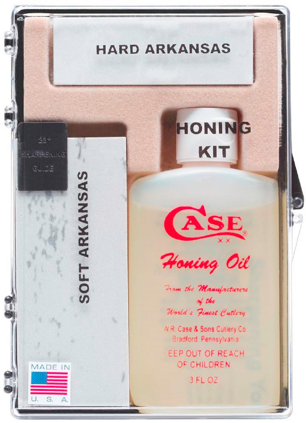 Make sure your knives stay sharp and in good condition with the WR Case & Sons Cutlery Co Sportsman's Honing Kit. This kit includes a coarse 4-inch soft Arkansas stone for shaping the edge and a fine 3-inch hard Arkansas stone for refining the edge. The 3-ounce bottle of honing oil is used with the Arkansas stones and only requires a small dab for effective use. Made in USA.