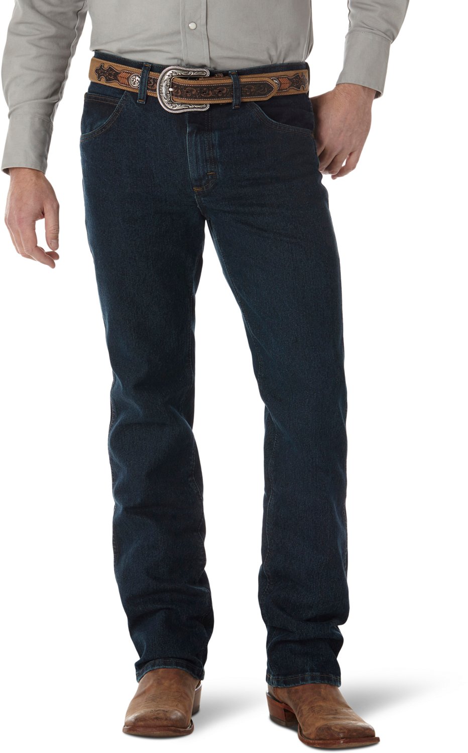 Step out feeling confident in the Wrangler Men's Premium Performance Advanced Comfort Slim Fit Jeans. The 70% cotton, 29% polyester and 1% spandex denim construction offers a soft feel all day, and the zip-fly with button closure provides a snug fit. The 2 back pockets allow you to conceal small items, and the Wrangler® stitching and leather patch details add a fashionable touch.