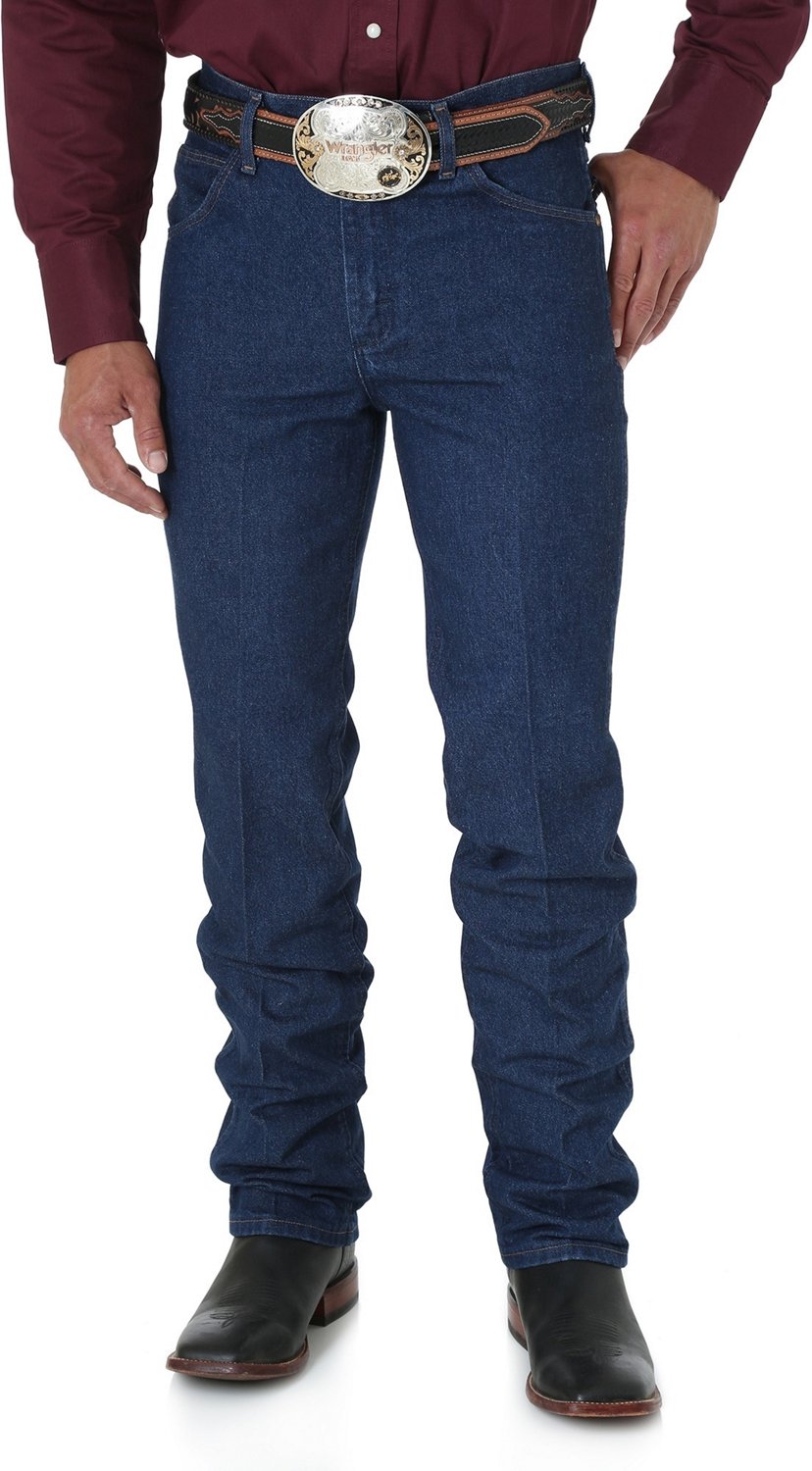 Try out a classic western look with the Wrangler® Men's Premium Performance Cowboy Cut® Slim Fit Jean. The jean features a comfortable waist design and deep front pockets and is made from 100% cotton with a ringspun denim construction for durability and casual style. Wrangler® patch.