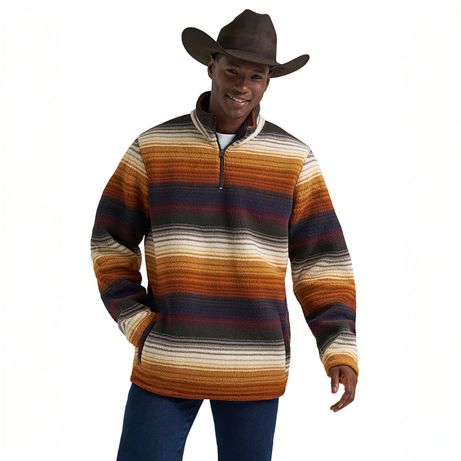 Look your best when you wear the Wrangler Men's Western Sherpa 1/4 Zip Sweatshirt. It is made of 100% polyester. The Sherpa lining provides additional warmth, and its 1/4 zip closure offers a secure fit. The kangaroo front pocket allows you to carry around small items.