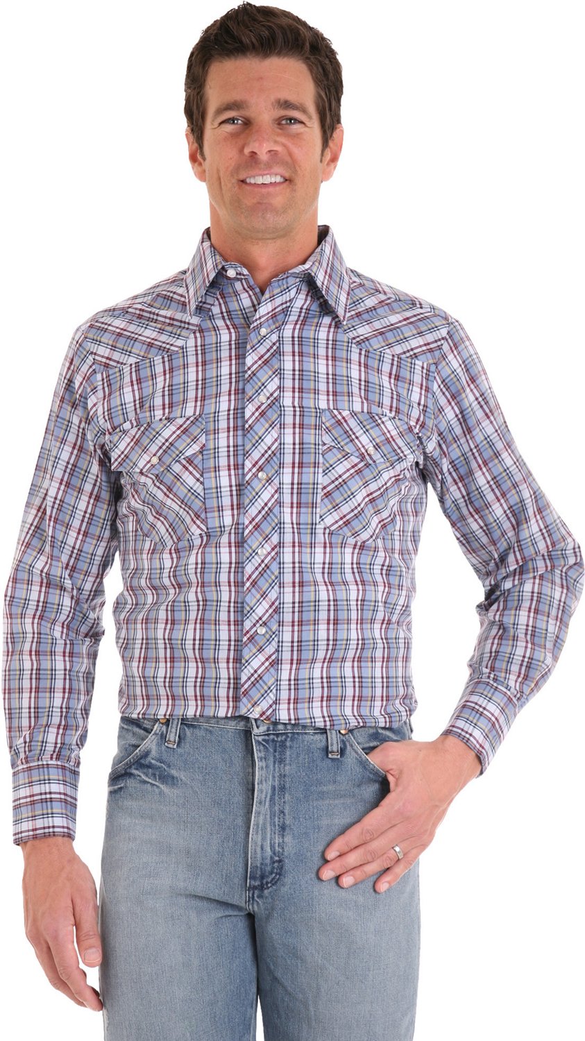 Enjoy the Western style of the Wrangler® Men's Western Sport Shirt, which is made of 55% cotton and 45% polyester for comfortable wear and features a yarn-dyed plaid pattern and a spread collar with Western-style front and back yokes. 2 snap flap pockets. Snap closure. Long sleeves with 3-snap cuffs.