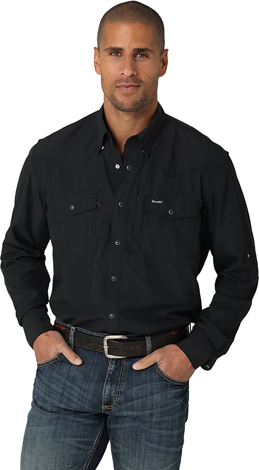 Bring style to your workday wardrobe by wearing the Wrangler Riggs Workwear Men's Western Performance Snap Long Sleeve Shirt. This shirt is made of 100% polyester and offers a vented back and moisture-wicking technology to help keep you feeling cool and comfortable and its UV protection keeps the sun's rays at bay.