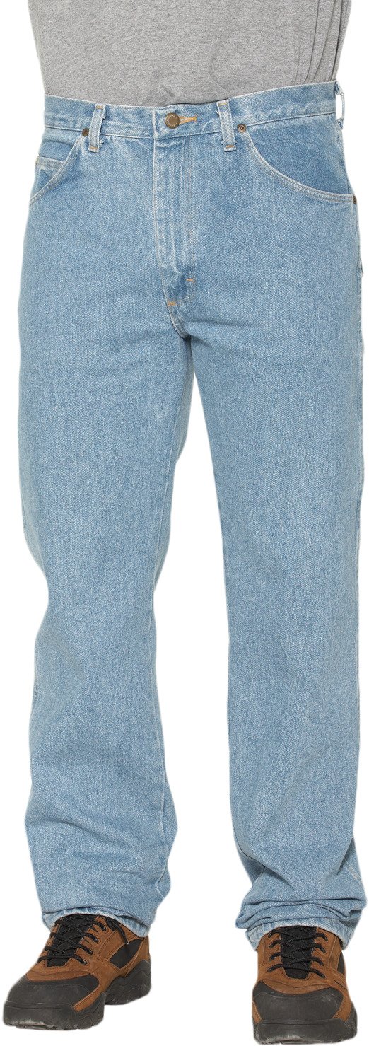 The Wrangler Rugged Wear® Men's Classic Fit Jean is constructed from durable 100% cotton denim and features a 5-pocket design with easy-entry, extra-deep front pockets and oversize hip pockets. The comfortable U-Fit crotch offers plenty of room for movement, and the legs fit easily over footwear and boots.