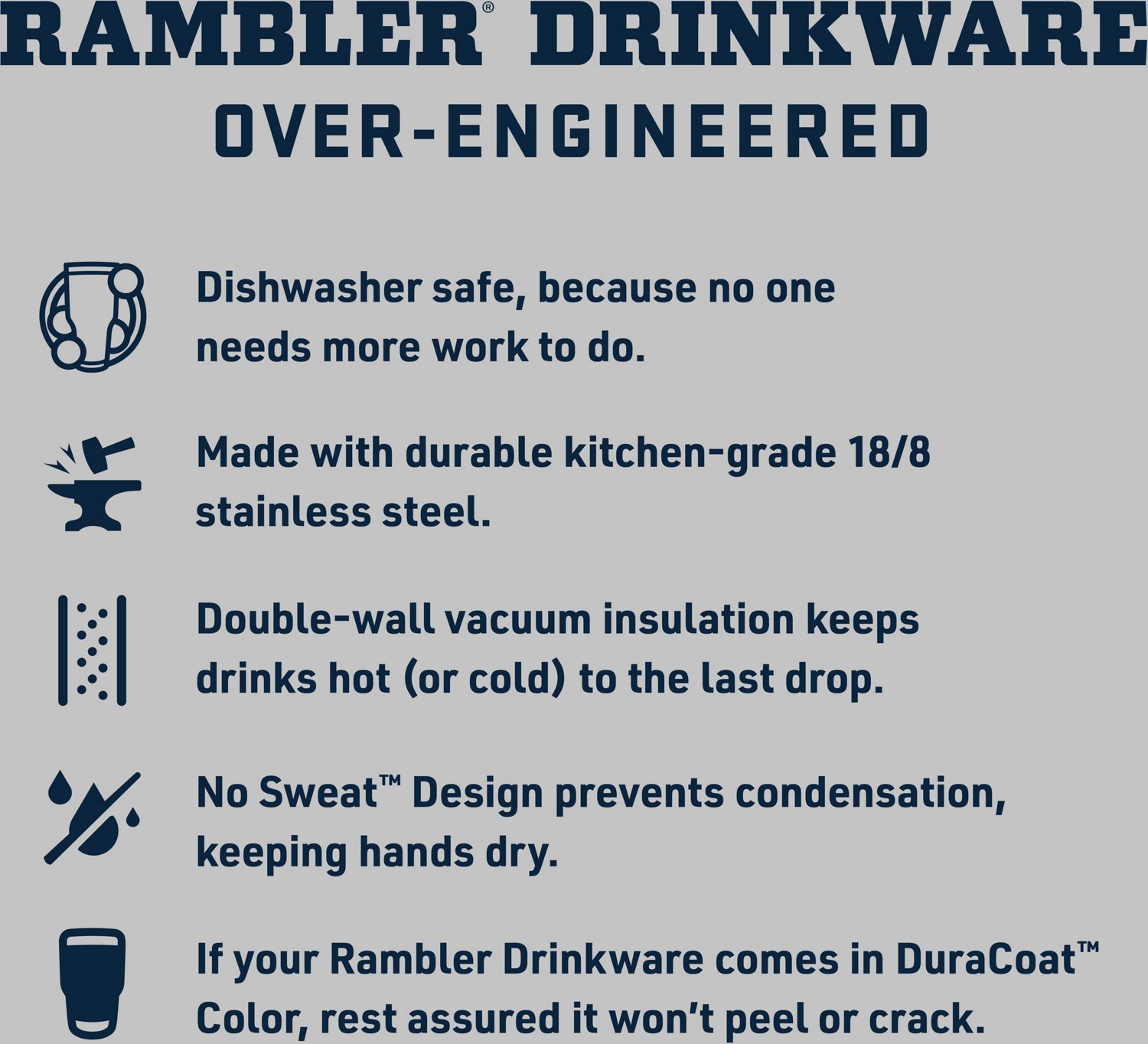 Pour your favorite hot or cold beverage in to the YETI DuraCoat Rambler 30 oz Tumbler and head out the door. No matter where you're headed, this bottle's double-wall vacuum insulation will keep your favorite drink icy cold or piping hot. Durable stainless-steel material with a DuraCoat™ Color finish that adds a fun look to the bottle.