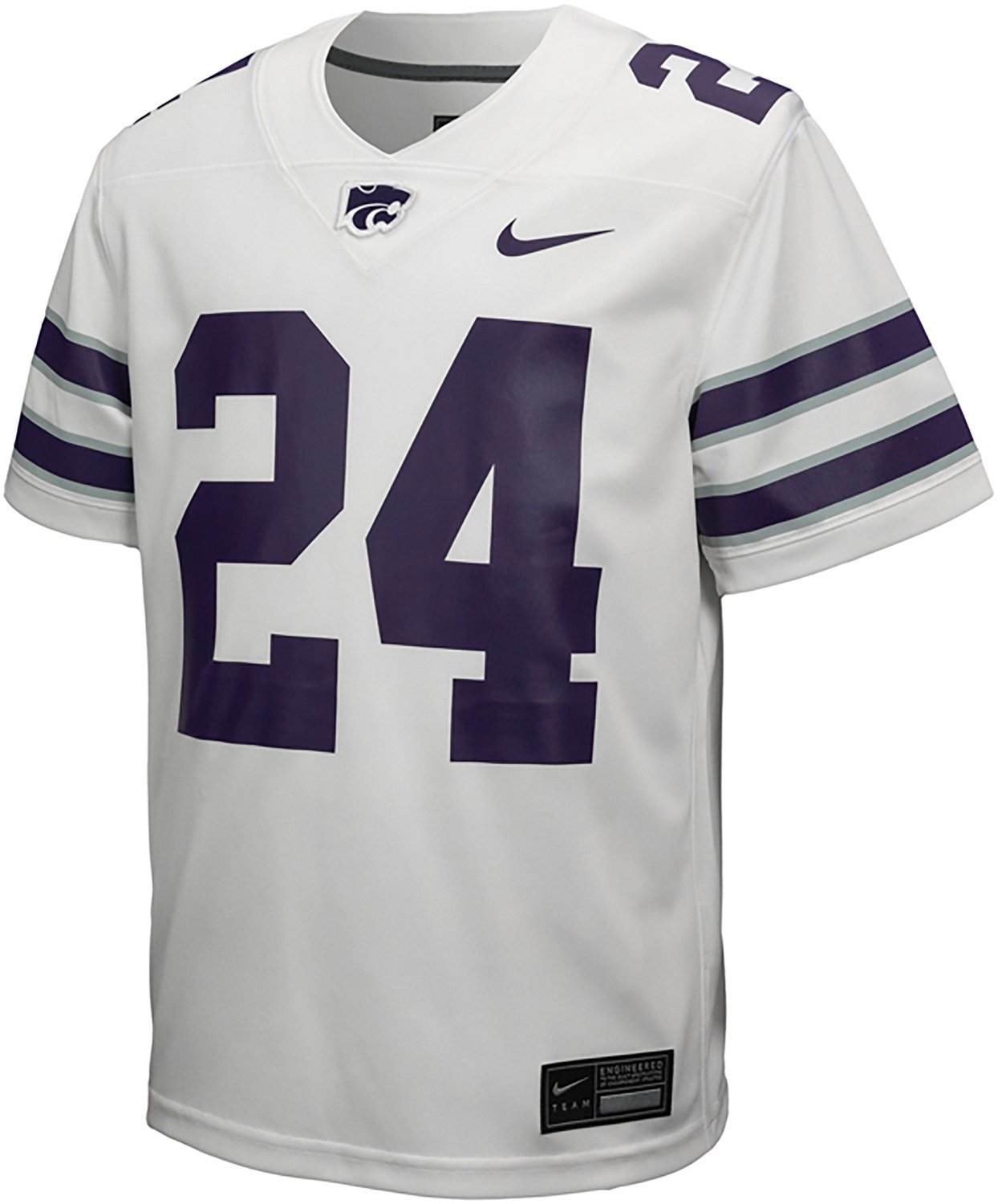 Get your young fan ready to cheer on the Kansas State Wildcats with this 24 Untouchable Football Jersey from Nike This jersey features heat-sealed graphics and a satin woven jock tag for a touch of stylish fandom Its loose fit and V-neck design offer a comfortable and classic look that's perfect for game day or any day Crafted from 100 polyester and features a stitched fabric applique at the collar it shows Kansas State Wildcats pride with lasting quality