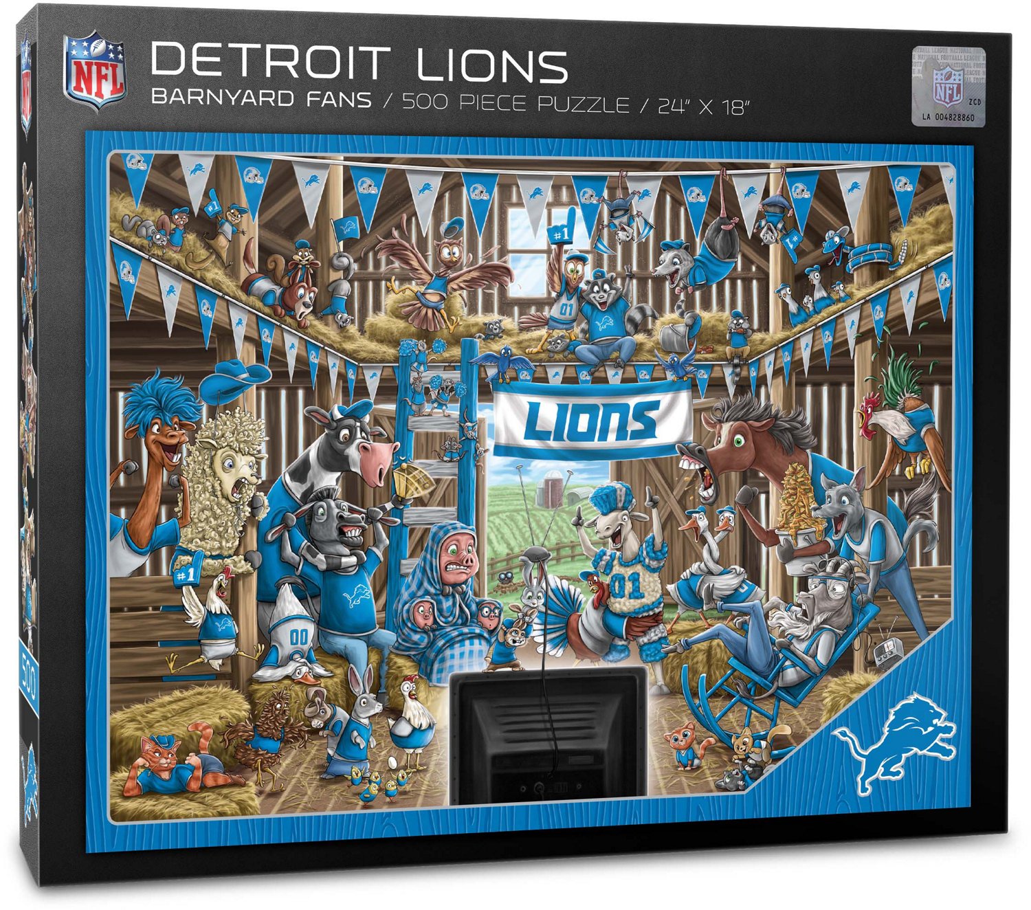 Have some barnyard fun and support the Lions when you put together the YouTheFan Detroit Lions Barnyard Fans 500-Piece Puzzle. This puzzle has a barnyard design with all of the animals cheering and watching your team play to express your fandom in a unique way. This puzzle measures 18 inches x 24 inches when completed.