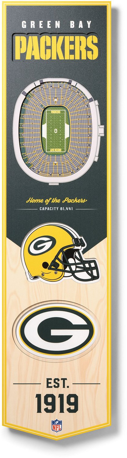 Display your love of the Packers with the YouTheFan Green Bay Packers 8 in x 32 in 3-D Stadium Banner. An ideal addition to your den, home bar or living room, the banner uses multiple layers to create a 3-D replica of your team's stadium, as well as featuring the official colors and logo of the Pack, so everyone can know who you cheer for on game day.