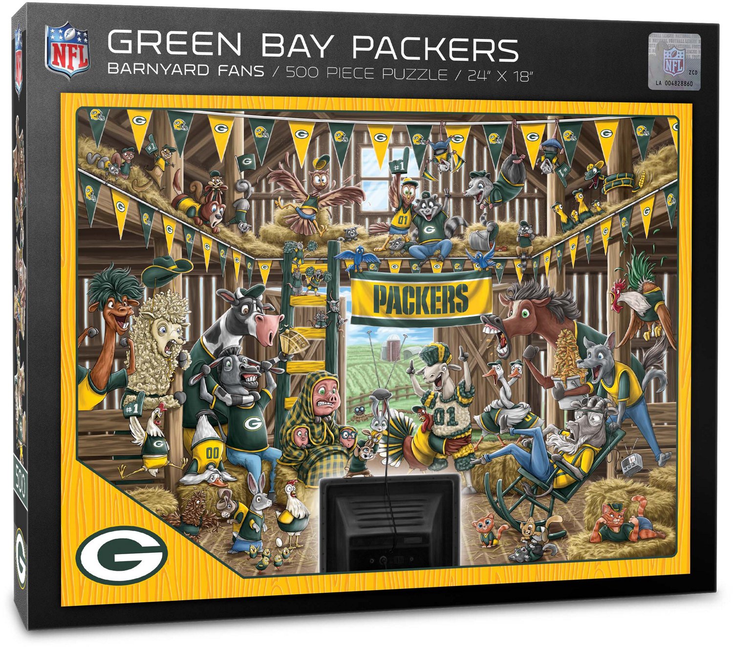 Have some barnyard fun and support the Packers when you put together the YouTheFan Green Bay Packers Barnyard Fans 500-Piece Puzzle. This puzzle has a barnyard design with all of the animals cheering and watching your team play to express your fandom in a unique way. This puzzle measures 18 inches x 24 inches when completed.