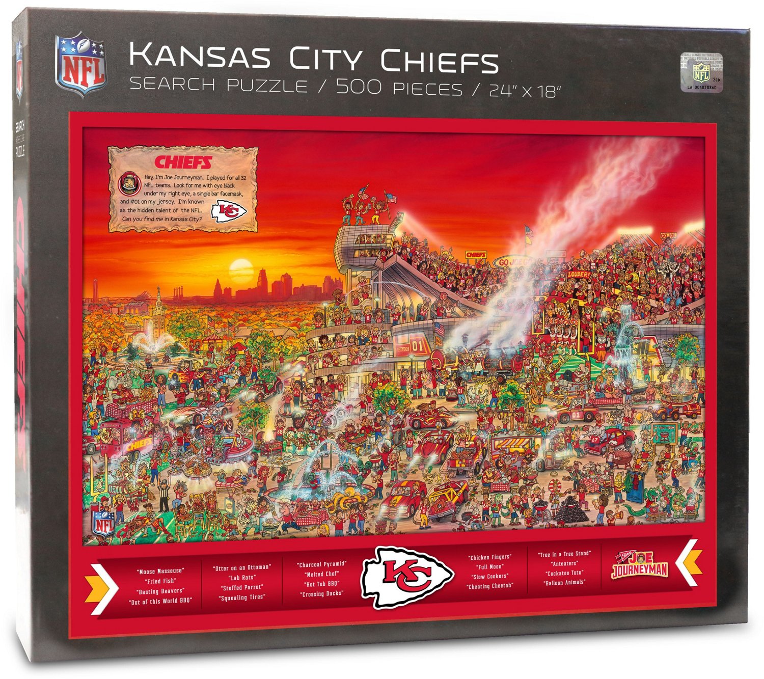 You'll have fun with family, friends, and fellow fans with the YouTheFan Kansas City Chiefs Joe Journeyman 500-Piece Puzzle. The puzzle features engaging hand-drawn illustrations that showcase your team's stadium, fans and more. Once the puzzle is assembled, it's time to search for fun seek-and-find scenes and Joe Journeyman, the only individual who's played on every team in the league.