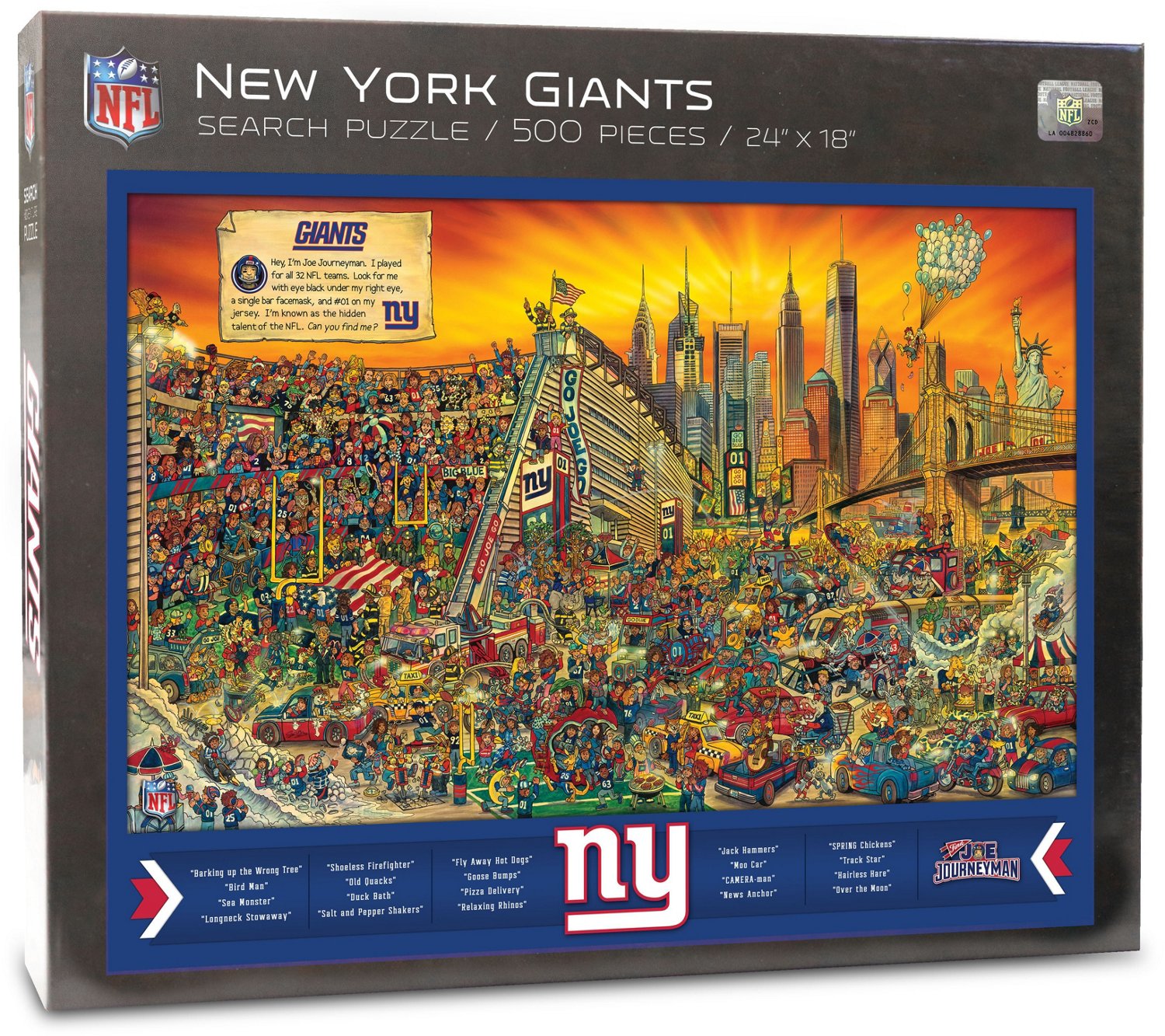 You'll have fun with family, friends, and fellow Big Blue fans with the YouTheFan New York Giants Joe Journeyman 500-Piece Puzzle. The puzzle features engaging hand-drawn illustrations that showcase your team's stadium, fans and more. Once the puzzle is assembled, it's time to search for fun seek-and-find scenes and Joe Journeyman, the only individual who's played on every team in the league.