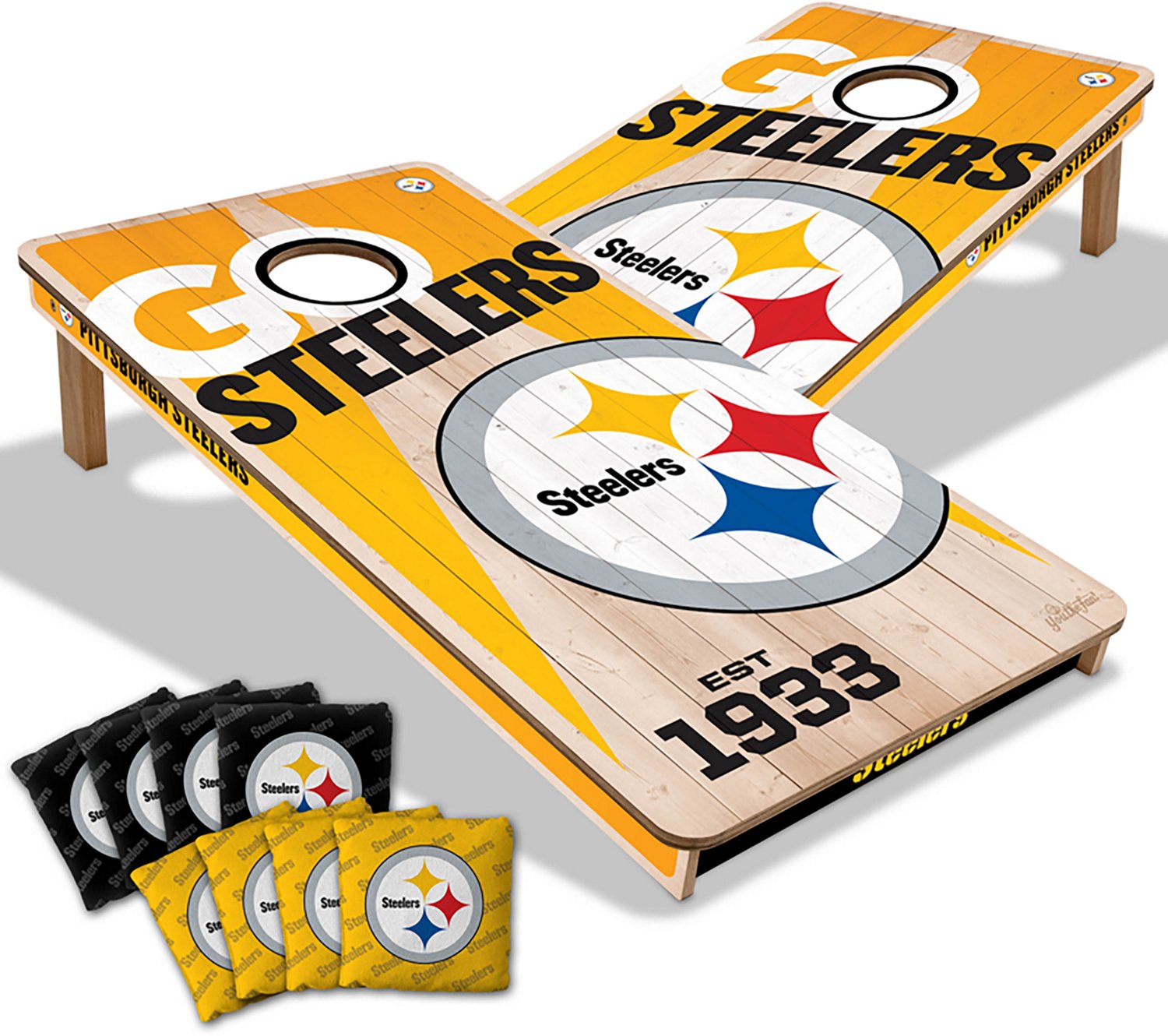 Friends and family will love challenging each other to cornhole at tailgate parties with this YouTheFan Pittsburgh Steelers Cornhole Set as the venue. Its durable all-wood board measures a match-size 2 ft. x 4 ft. and 15mm thick, making it ideal for regulation play. The Steelers graphics printed on its surface let everyone know how committed you are to Pittsburgh sports.