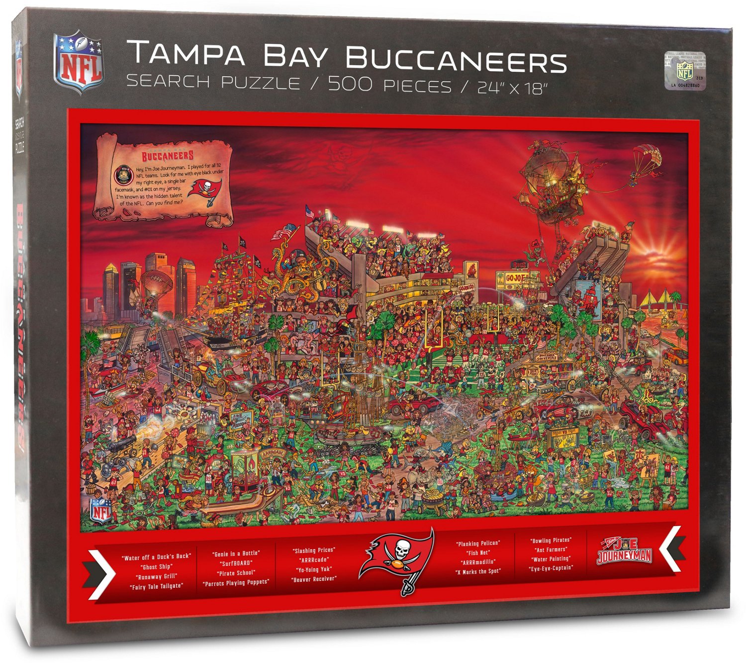 You'll have fun with family, friends, and fellow Bucs fans with the YouTheFan Tampa Bay Buccaneers Joe Journeyman 500-Piece Puzzle. The puzzle features engaging hand-drawn illustrations that showcase your team's stadium, fans and more. Once the puzzle is assembled, it's time to search for fun seek-and-find scenes and Joe Journeyman, the only individual who's played on every team in the league.