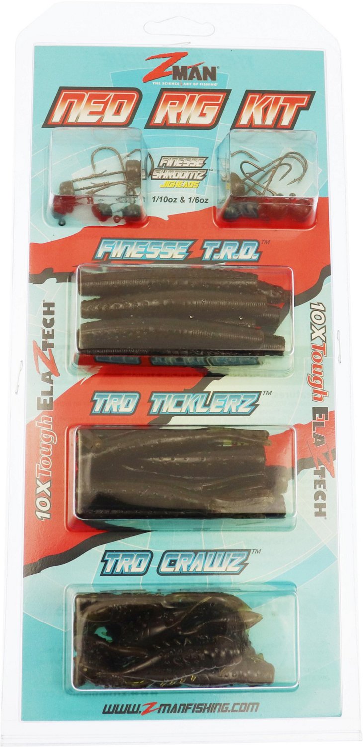 Be prepared for your fishing trips with the Z-Man Ned Rig Kit. This Ned Rig kit features popular and versatile 10X Tough ElaZtech® finesse baits and ShroomZ™ jigheads. It is ideal for bass and a variety of other freshwater and saltwater fishing.