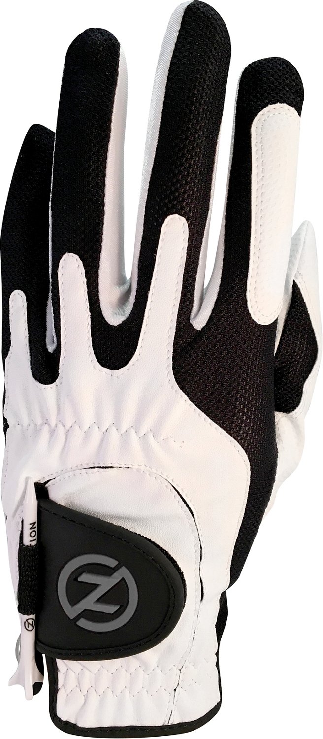 Firmly grip your clubs with the Zero Friction Men's Synthetic Performance Golf Glove, which molds to fit the contours of your hand and allows touchscreen access. The glove features a grippy palm and fingers, a cabretta leather patch and breathable mesh to help keep your hand cool while you play.