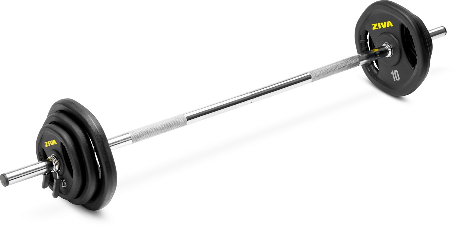 Complete your weightlifting workout at home with a Ziva RPU 35lb Body Pump Set. This commercial-quality equipment set features solid steel weight plates with a rubber-polyurethane finish to protect your floors and furniture. Knurled handles provide a nonslip grip, while easy-to-use clamp collars let you adapt weights to your routine.