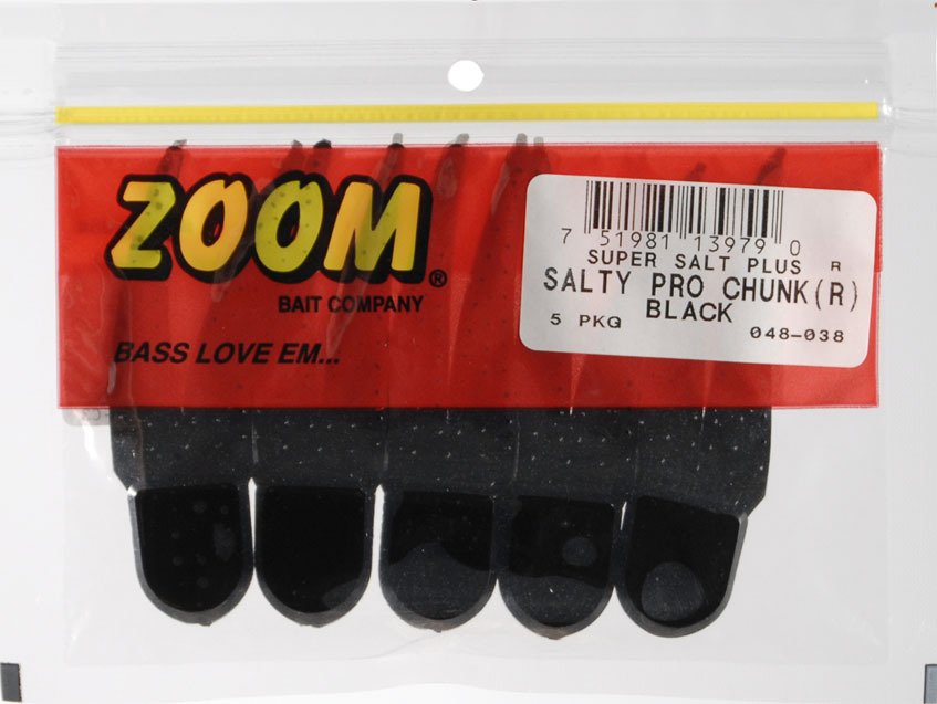 The Zoom 3-1/2" Salty Pro Chunks 5-Pack attract bass and other freshwater fish. The soft plastic construction is salt-impregnated to help hold bites. Attach to the back of a rubber or silicone-skirted jig as a trailer. Great on heavy tackle in heavy cover.