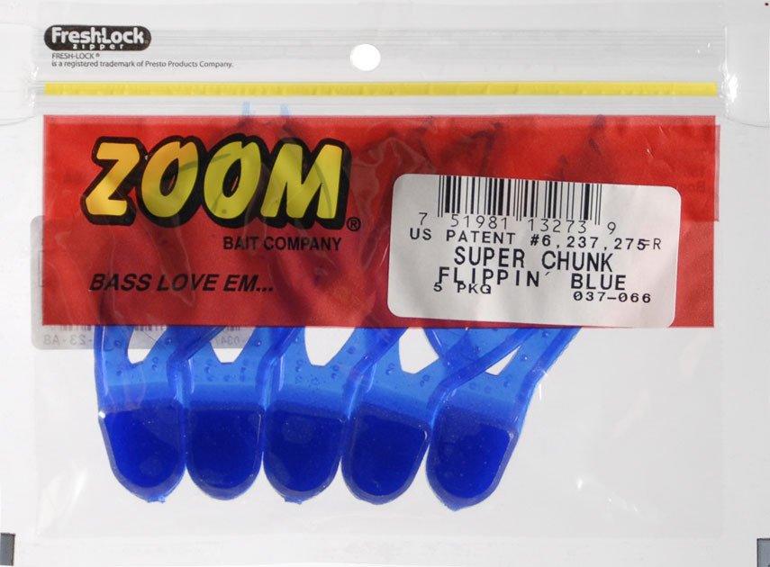 The Zoom 4" Super Chunks attract bass and other freshwater fish. The tough, thick plastic construction stays on the hook. Bat-tail wings flutter easily on the fall and move appealingly when crawled or hopped on the bottom. Thin and supple bat-tails.