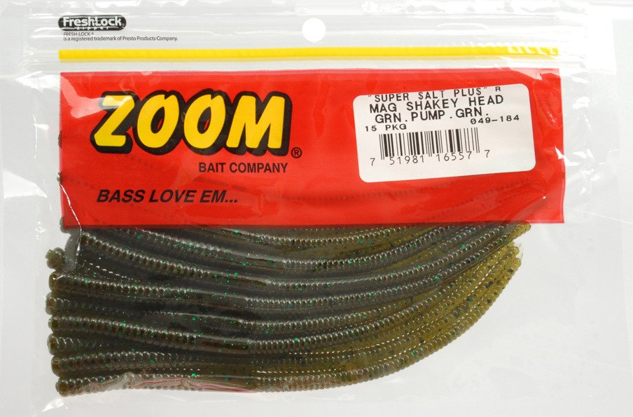 The Zoom 7" Mag Shakey Head Worms 15-Pack attract bass and other freshwater fish. The soft plastic construction is salt-impregnated to help hold bites. Slender body offers great movement.