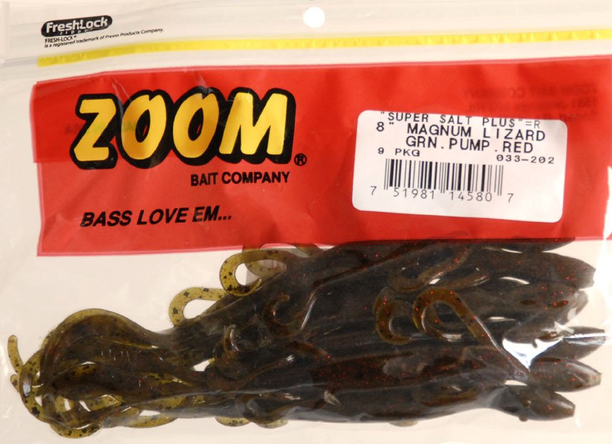 Entice freshwater bass and other species to your hook with the Zoom Magnum 8" Lizards 9-Pack. These lizards feature a natural appearance that attracts bites. Soft plastic construction.