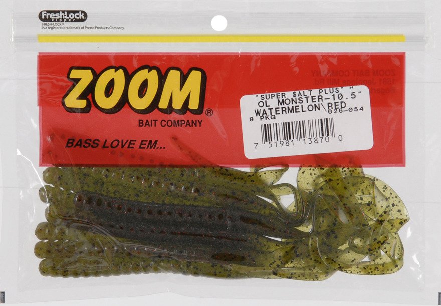 Head out fishing with the Zoom Ol' Monster 10-1/2" Worm Baits 9-Pack and reel in a trophy catch. These freshwater baits feature slender profiles and curved tails. Great for pitching and flipping on a Texas rig to attract largemouth bass.